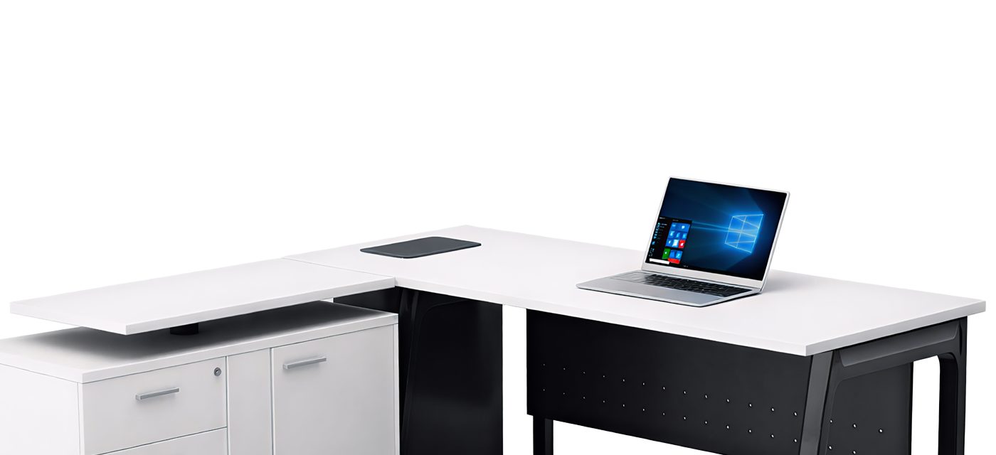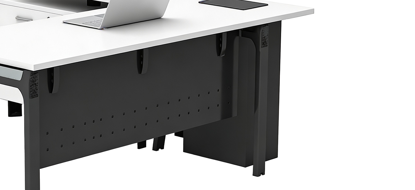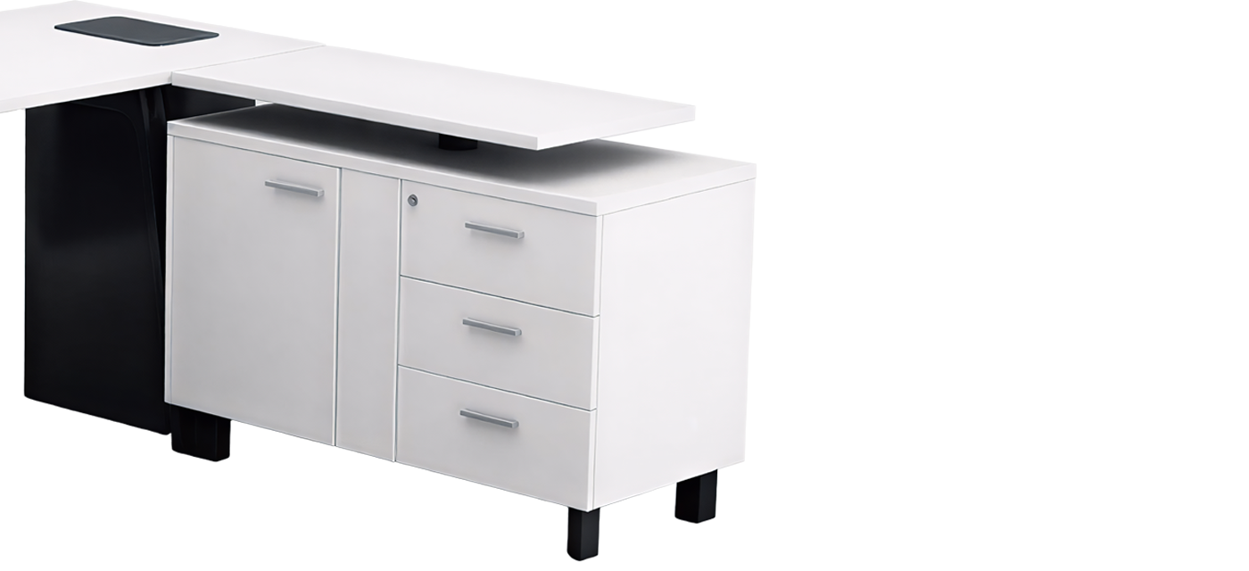 The integrated side storage brings convenience and order to the workspace, offering ample space for files and essentials. Its balanced design keeps everything within reach while maintaining a clean, professional aesthetic.