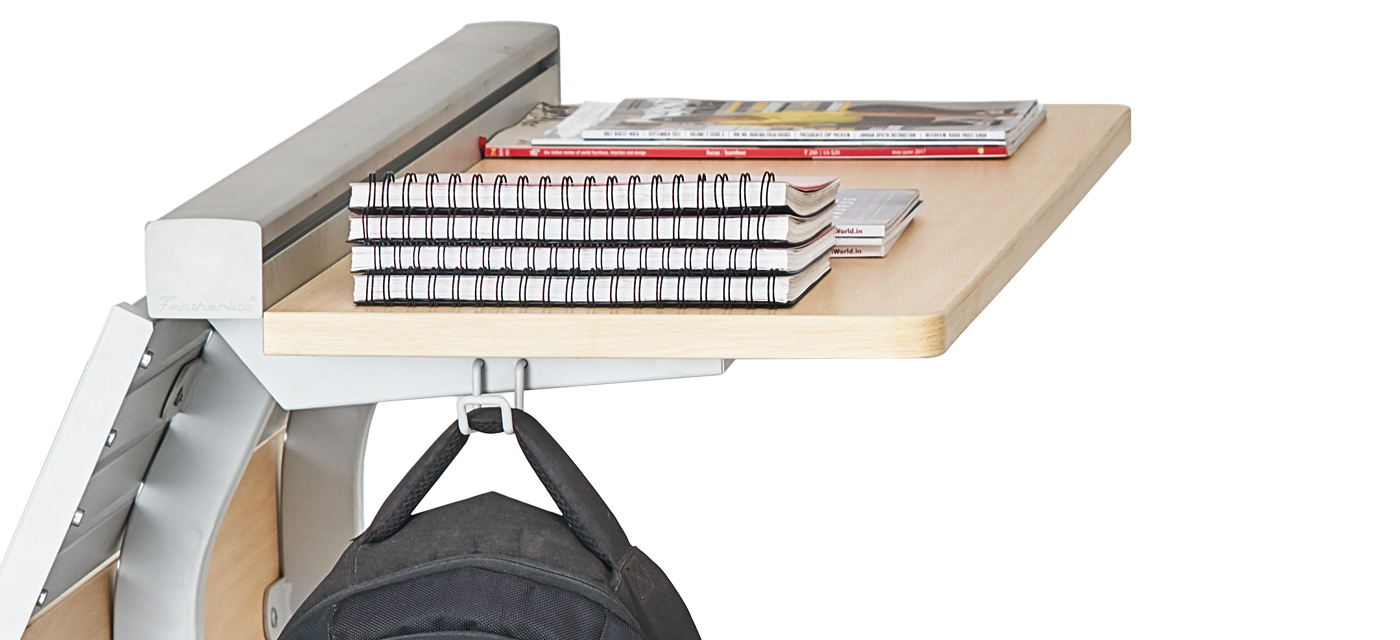 The integrated bag hook gives students a dedicated spot to store backpacks and belongings, keeping floors uncluttered and movement effortless. This simple yet essential feature enhances classroom safety, organization, and accessibility.
