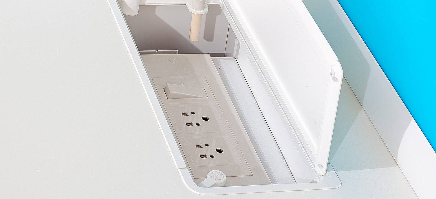 Equipped with flip-up access points and wire entry covers, cables can be easily routed from the floor to the surface. This system ensures smooth connectivity while maintaining a streamlined appearance.